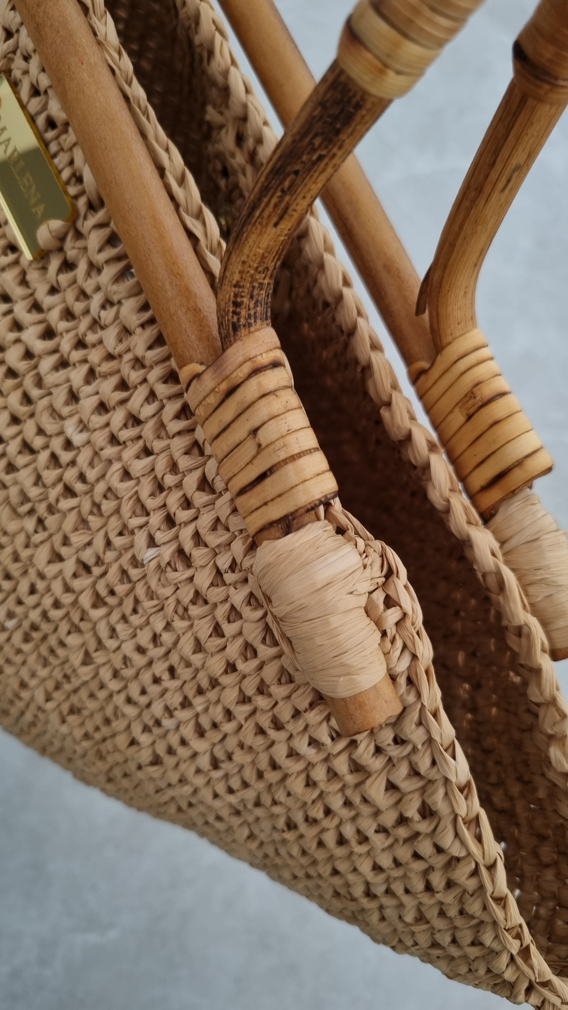 Handwoven raffia bag with bamboo handles. Lightweight summer tote, natural and elegant. Perfect for beach, travel and everyday wear.