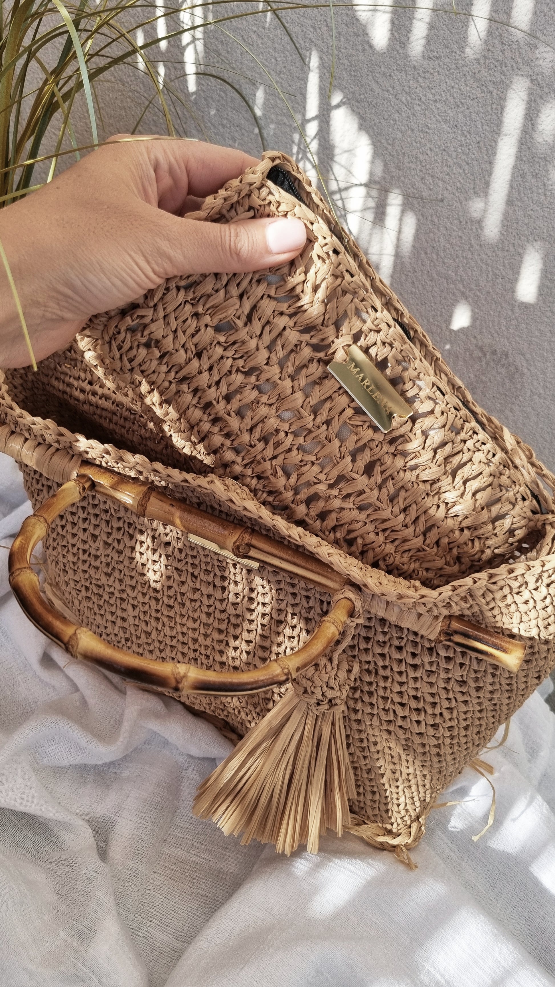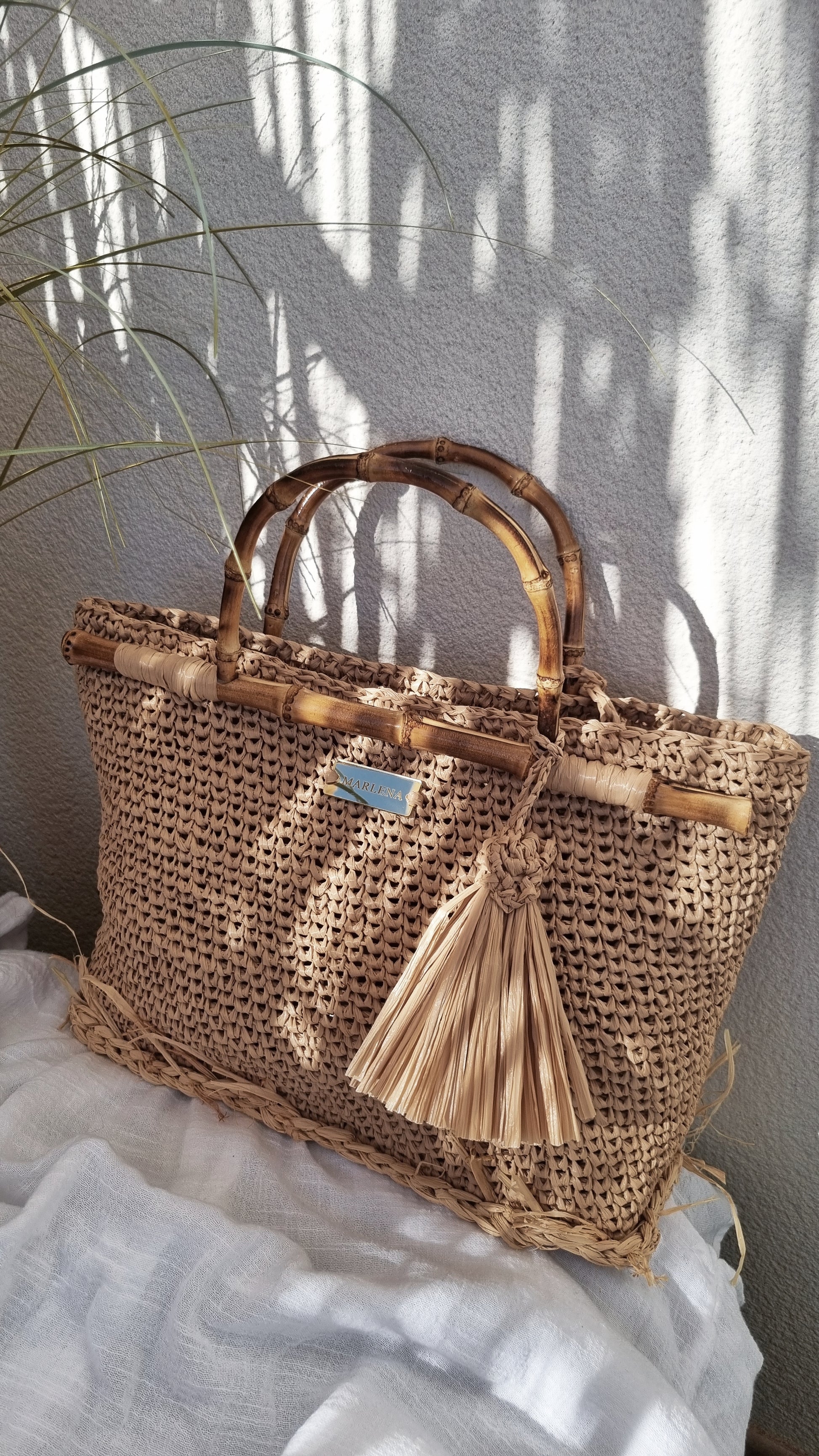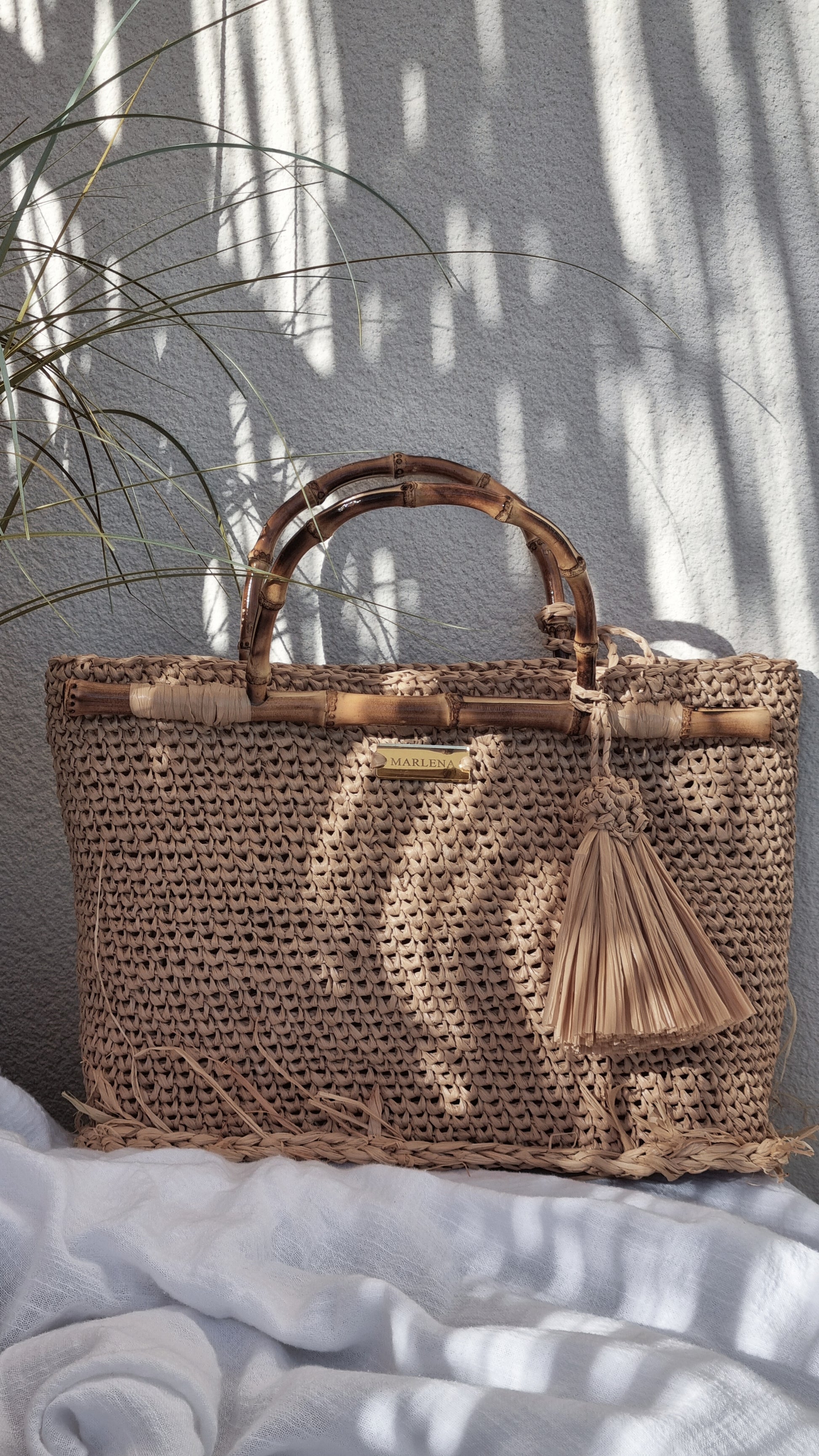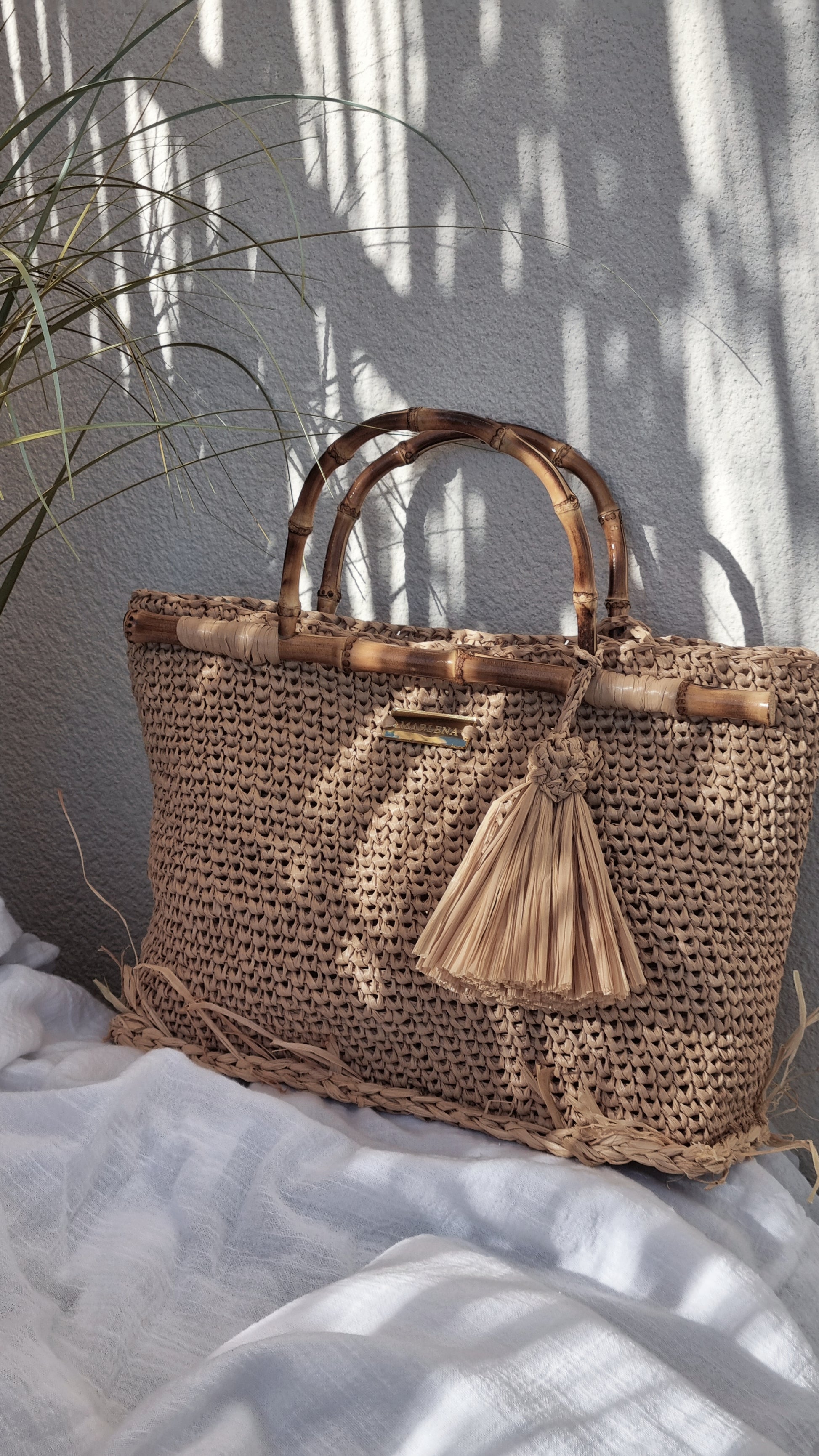 Handwoven raffia bag with bamboo handles. Lightweight summer tote, natural and elegant. Perfect for beach, travel and everyday wear.